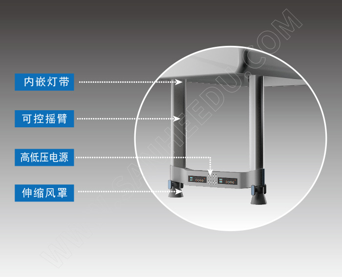 整體是由鋁型材、塑料等材質(zhì)組成,集成了通風(fēng)、電、光等多種功能,并內(nèi)設(shè)高亮度LED燈條,采用整體橋式架構(gòu),保持視線的通暢,可控?fù)u臂可以按需收放,簡(jiǎn)化了電預(yù)埋的施工,釋放了實(shí)驗(yàn)臺(tái)位置固定的束縛。