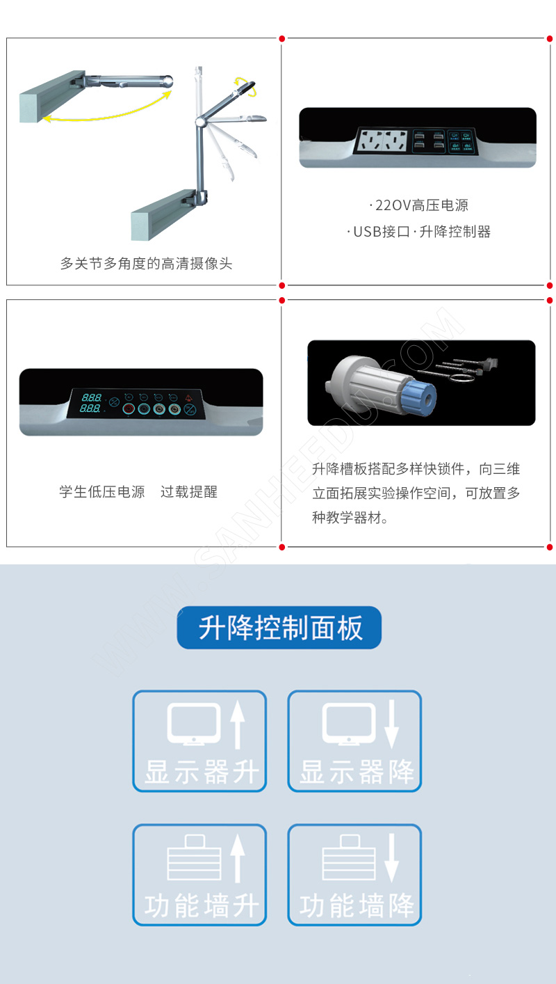 升降功能墻:內(nèi)置學(xué)生電腦、升降顯示器、兩個(gè)多關(guān)節(jié)多角度的高清攝像頭、USB插座、電源插座、控制開關(guān)、槽板、配合快鎖件等